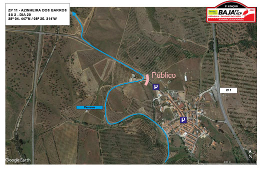 Junto à povoação de Azinheira dos Barros. Os concorrentes percorrem uma primeira passagem junto à povoação em velocidade reduzida, mas logo depois reiniciam a prova ao atravessarem a estrada de Azinheira em direção a Mosqueirão, a uma velocidade de corrida. Consulte ZP11 no Google Maps.