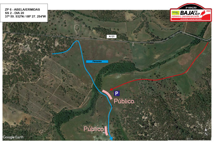 Na EN 121, sensivelmente ao lado do km 21 (a 2km de Ermidas), deixar o asfalto para terra e seguir durante 2km até encontrar o percurso. Zona de travessia de ribeira, seguida de uma zona sinuosa com boa visibilidade. Consulte ZP6 no Google Maps.